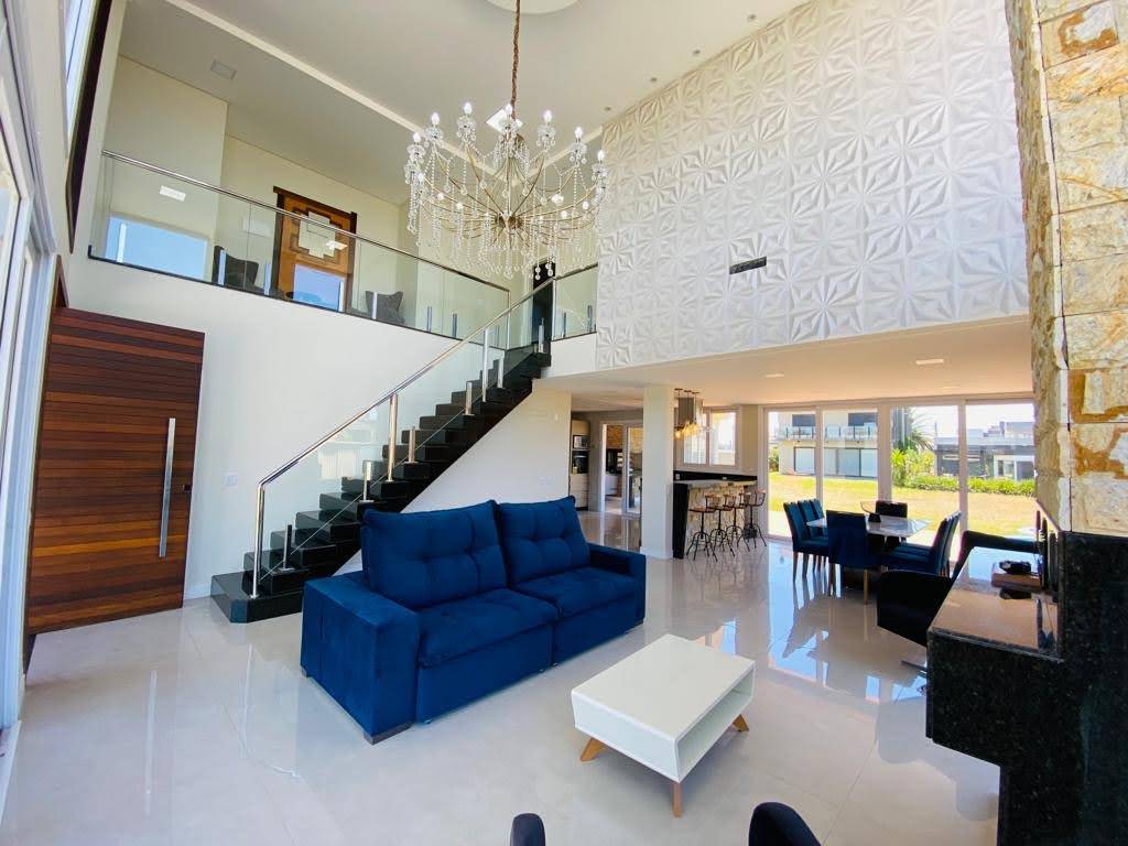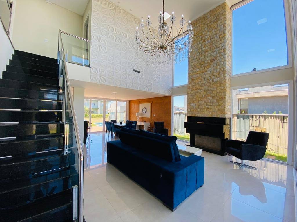 Sensacional imóvel, PRONTO para OCUPAR, localizado em condomínio de luxo em Capão da Canoa, CAPÃO ILHAS RESORT, BEIRA-LAGO, DECK e PISCINA PRIVATIVA, são 320 M², distribuídos em 4 amplos dormitórios, sendo 3 suítes, living com pé direito duplo, lareira, lavabo, cozinha com linda bancada em granito, escada toda revestida em granito, corrimão inox, MOBILIADO, tudo NOVO, espaço GOURMET com CHURRASQUEIRA, pergolado, água quente e gás central, esperas p/ ar split, vaga para carros e muito mais.
