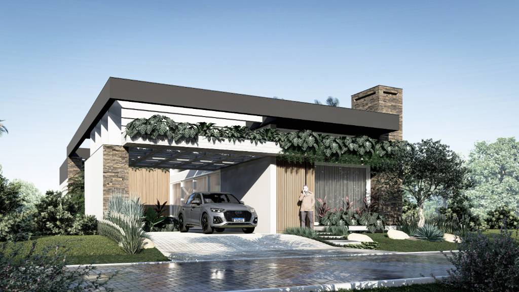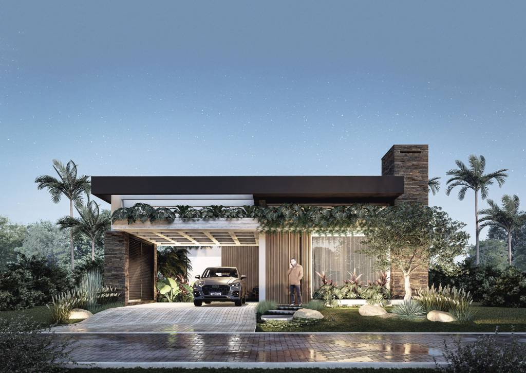 Casa em condomínio fechado a venda com localização e posição solar privilegiada ao lado do clube. Térrea com 174m² e mais 25m² de garagem. Acabamento em concreto aparente na fachada, living com pé direito alto. São 4 suítes independentes, cozinha integrada com churrasqueira, lavabo. Esquadrias de PVC com automação. Garagem para 2 carros, lavanderia e depósito. Na área de lazer, uma piscina em concreto, hidromassagem, paisagismo com irrigação automática, e projeto maravilhoso de iluminação.