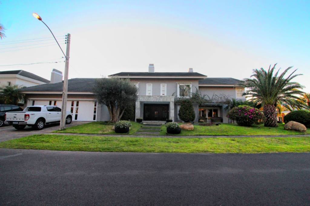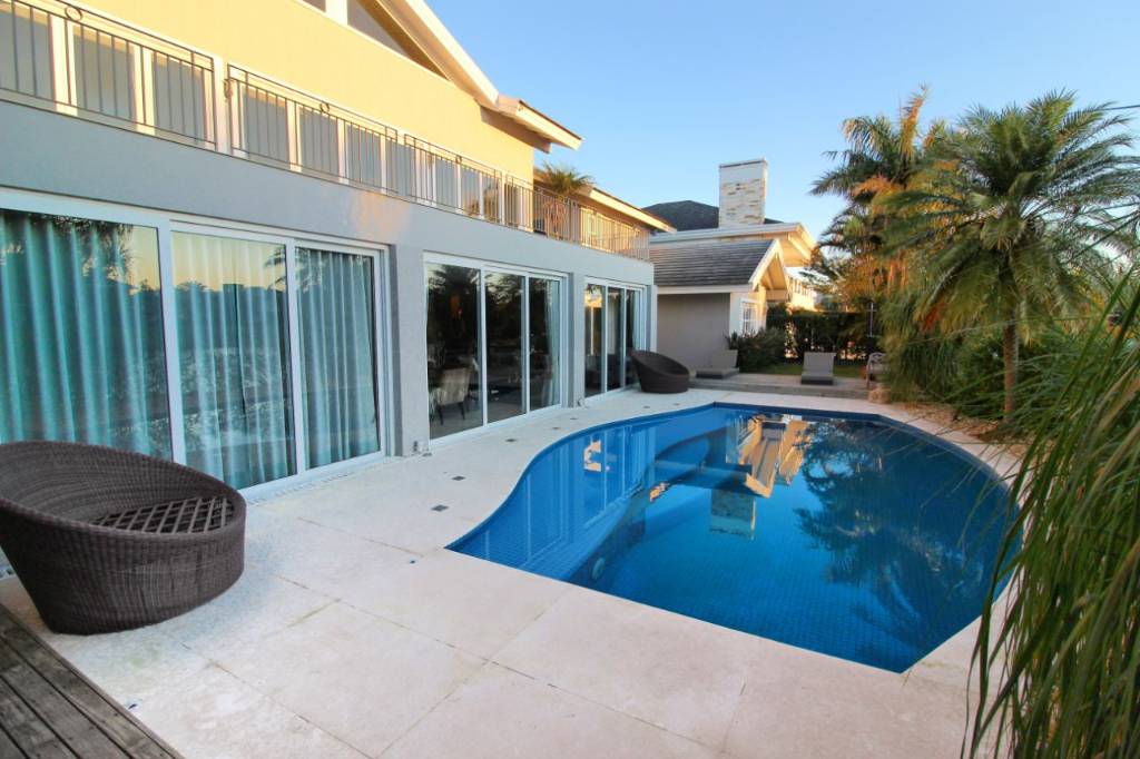 Belíssimo sobrado com 800M² (uma das maiores do condomínio) em dois terrenos. Composta de 3 suítes com banheira de hidromassagem (sendo uma master), banheiro exclusivo para os outros dormitórios, garagem fechada com vaga para 3 carros, 3 lareiras, espaço gourmet interno com churrasqueira rotativa e forno de pizza, quiosque completo com churrasqueira no deck da piscina. Próxima a infraestrutura, mobiliada e decorada