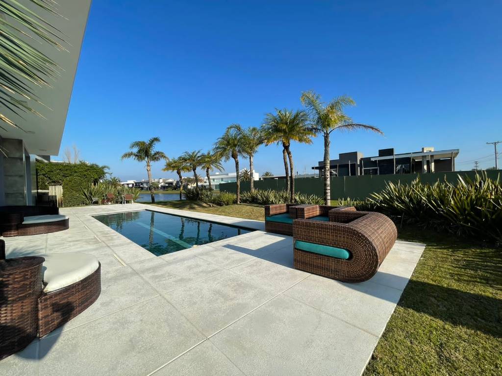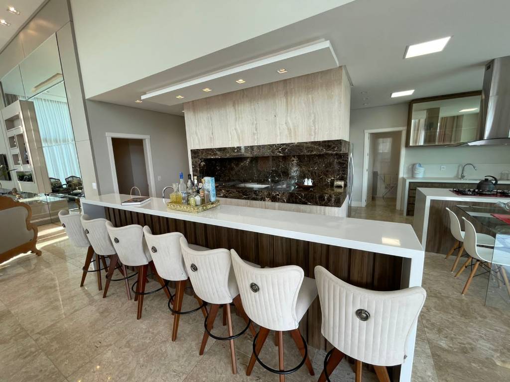 Sobrado em excelente localização, mobiliado e decorado, possui 5 suítes individuais mais dependência de empregada, living em 3 ambientes com lareira, cozinha americana com espaço gourmet e churrasqueira com parrilha, jardim com irrigação, piscina de concreto com espera para aquecimento, iluminação em LED em toda a casa, 100% climatizada, esquadrias em PVC preto, vaga para até 04 carros, sistema de wi-fi inteligente, 2 depósitos e fechadura digital.