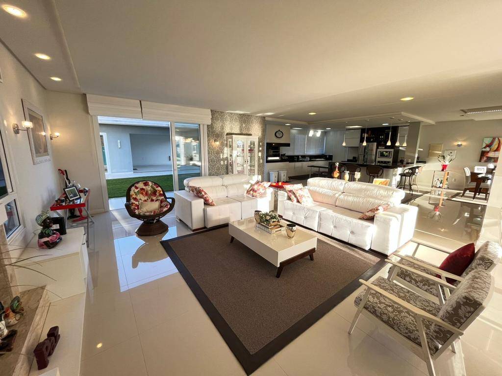 Sobrado alto padrão no Condomínio Malibu, mobiliado e decorado, com 5 dormitórios, sendo 3 suítes, suíte máster com closet e hidromassagem, terraço, living em 3 ambientes com lareira, cozinha americana com churrasqueira, lavabo, área de serviço, salão de festas, amplo pátio e abrigo para 2 carros.